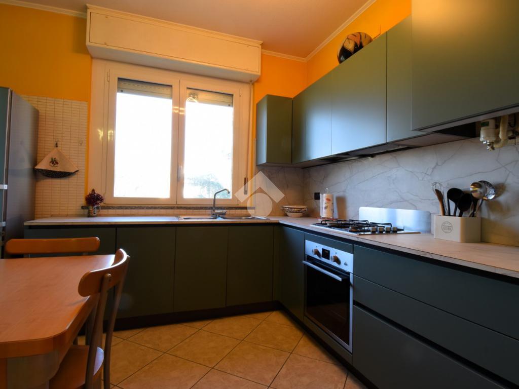 L'ingresso si apre su un accogliente soggiorno collegato alla cucina resa a vista, con affaccio sul giardino condominiale.